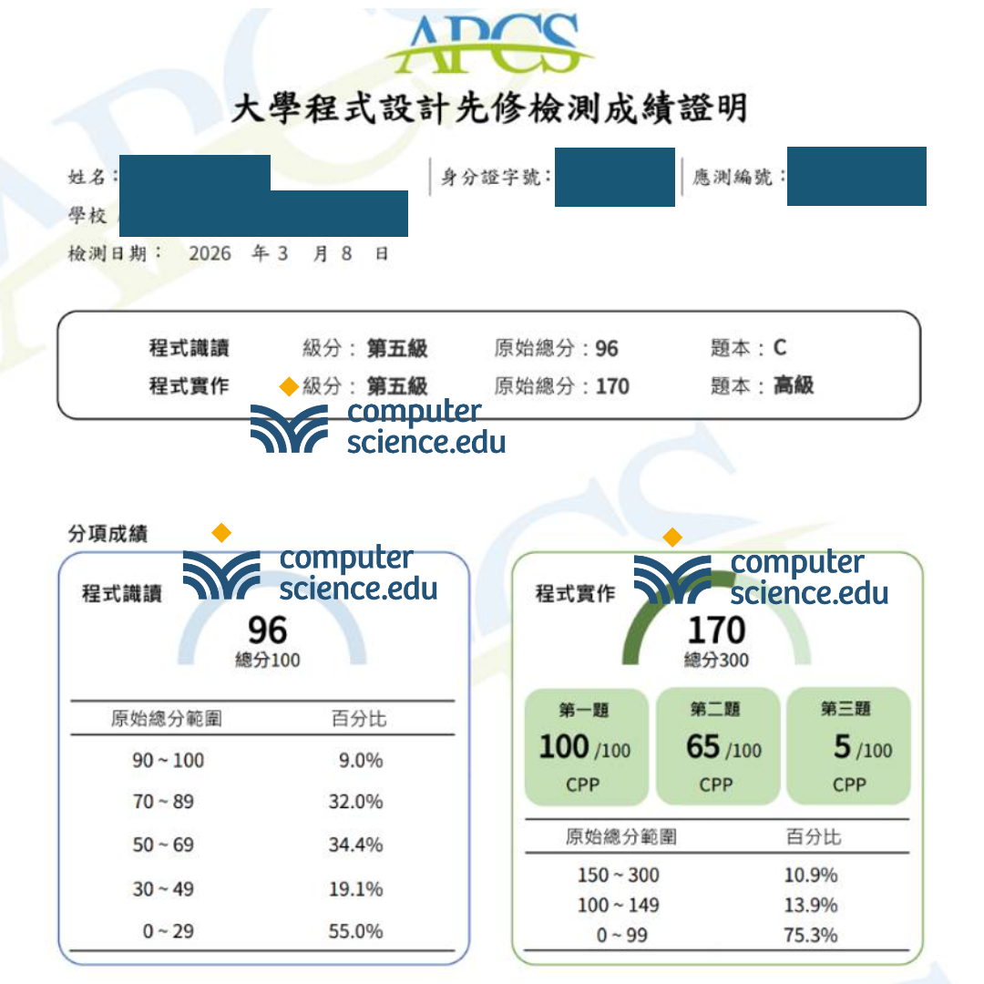 - 「程式識讀」原始分數滿分100分,「程式實作」原始分數300分。