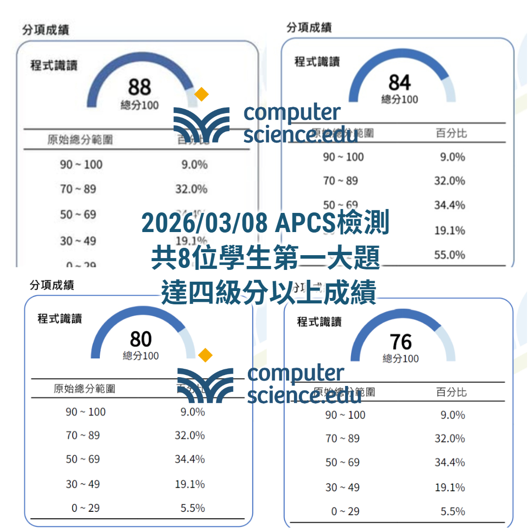 ●課程內容:APCS「第二大題:程式實作」範圍,建議有C++基礎的學生參加,課程內容會以APCS實作題初級、中級和中高級的題目練習為主,目標實作三~四級分,搭配歷屆試題解題。