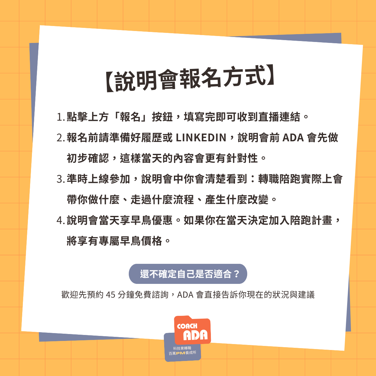 ⚠️ 報名前請準備好履歷或 LinkedIn,若報名時無法提供連結也請用一句話說明您目前現況,說明會前 Ada 會先做初步確認,確保能更有效地幫助您!