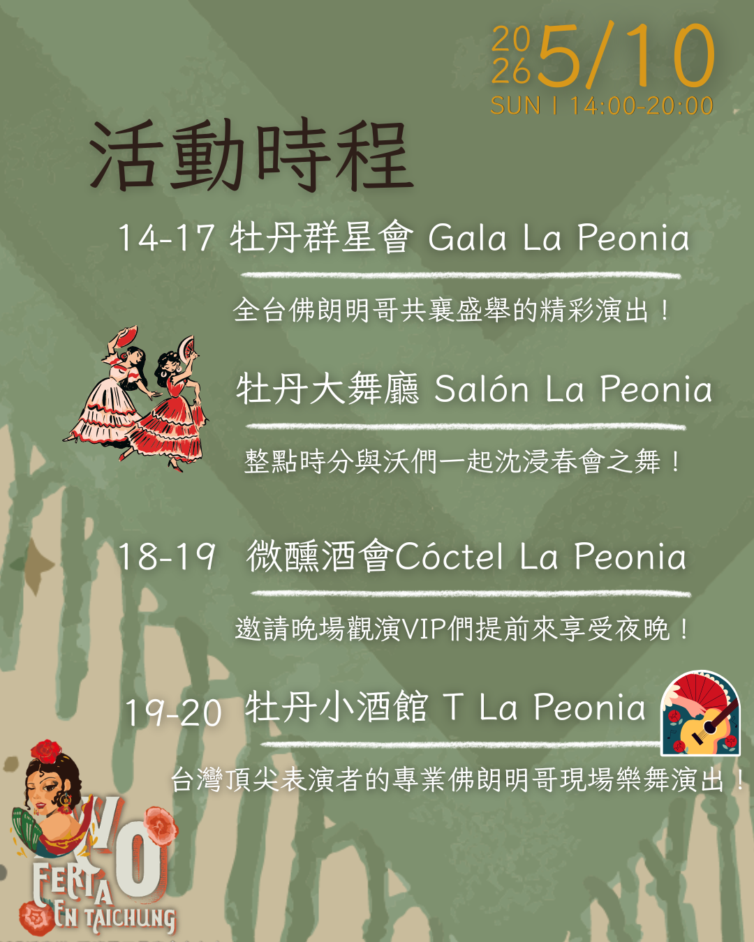 💃 14:00-17:00 Flamenco dance performance + Sevillanas dance trial session(every hour on the houy)