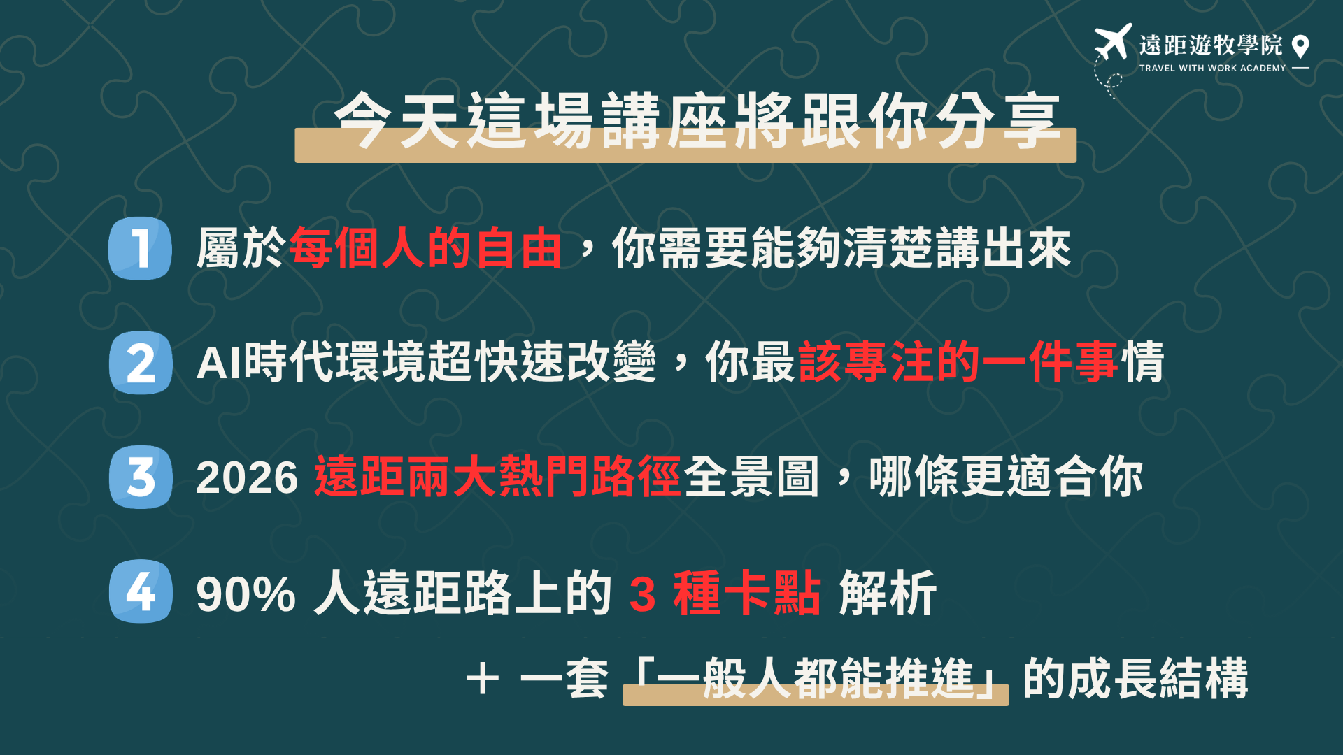 你也想要更自由的工作與生活, 但一直卡在:我到底該走遠端上班、自由接案,還是先從別的方式開始? 這場免費公開說明會,會帶你看懂不同路線的差別與取捨、AI 時代下更值得開始的方向,以及遠距遊牧學院第二屆的雙軌成長設計。 不是空談夢想,而是幫你把「也許有一天」慢慢變成「我也正在路上」。