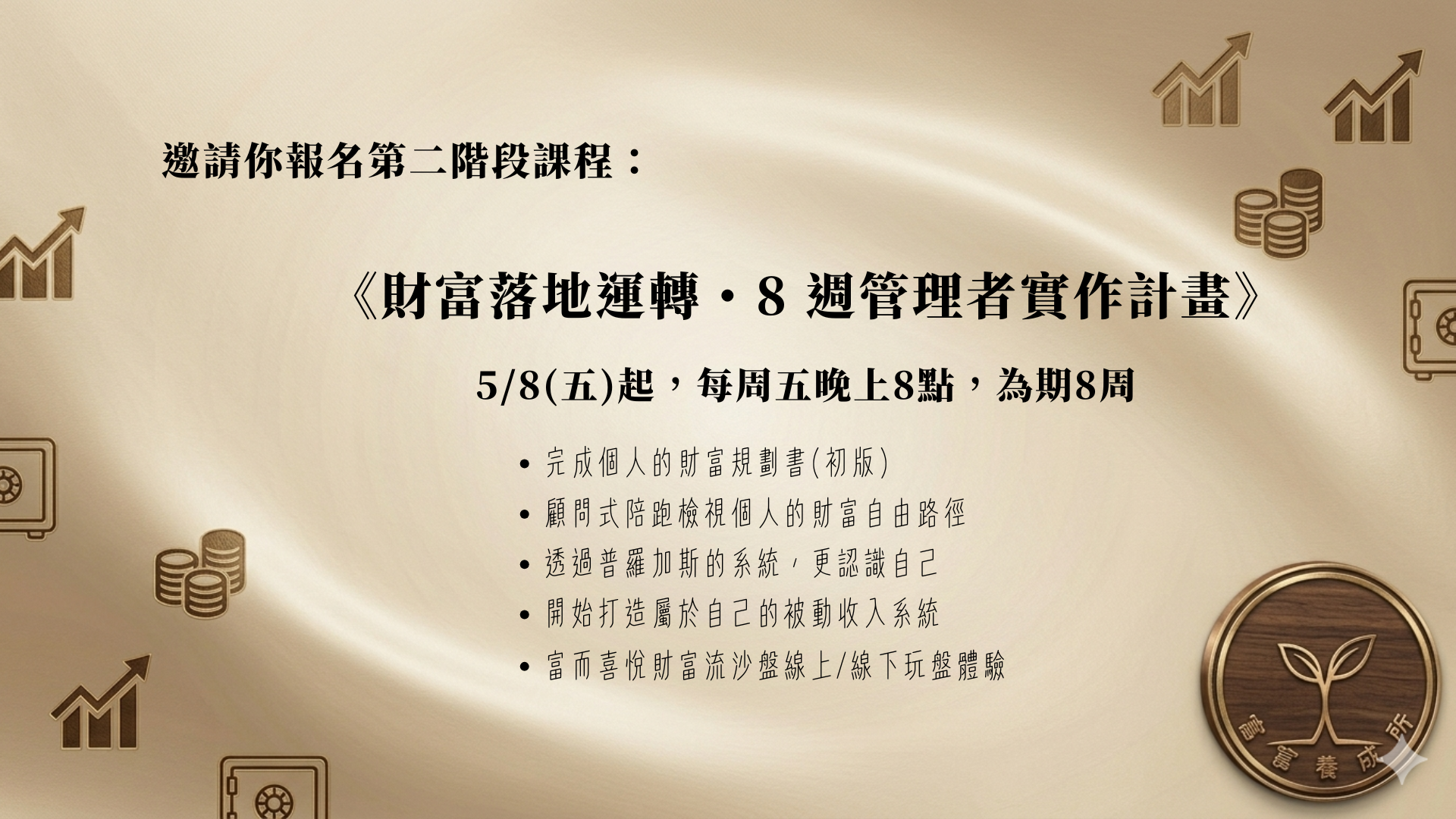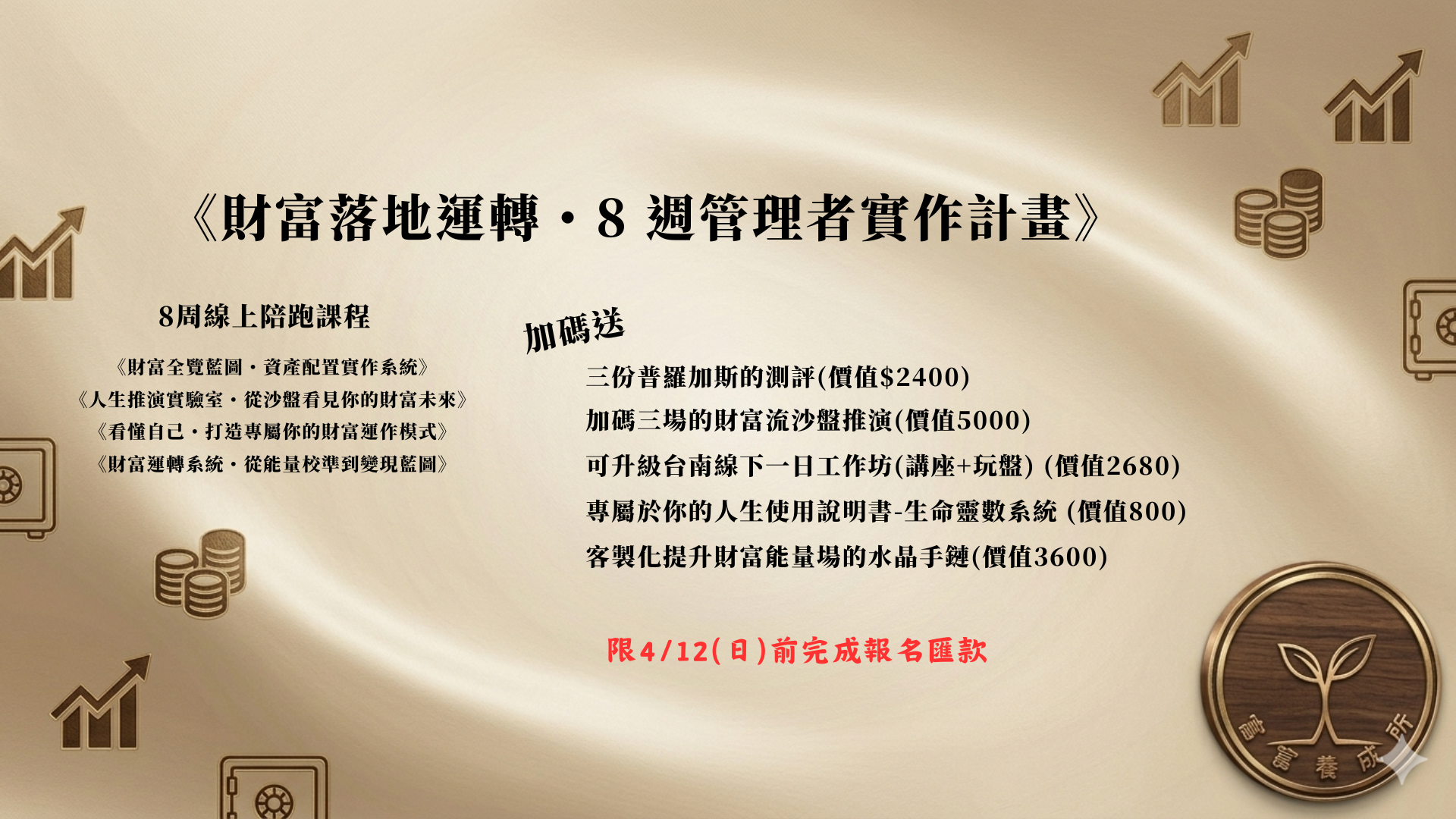 從用力理財到優雅管理|財富落地運轉・8 週實作者計畫 你是在「求財」,還是在「管理財富」? 多數人理財失敗,並非不夠努力,而是因為始終站在「存錢者」的視短,而非「管理者」的高度。當理財需要消耗大量意志力時,它就注定無法長久。《財富落地運轉》是一場為期 8 週的深度實作,專為想擺脫模糊焦慮、建立自動化財富系統的你設計。 這不只是一堂理財課,而是一場人生運轉的校準實驗。我們將帶領你跨越財商、情商、逆商等六大商數,結合「財富流沙盤」與「普羅加斯天賦測評」,幫助你停止違反天性的內耗,把主導權拿回手中