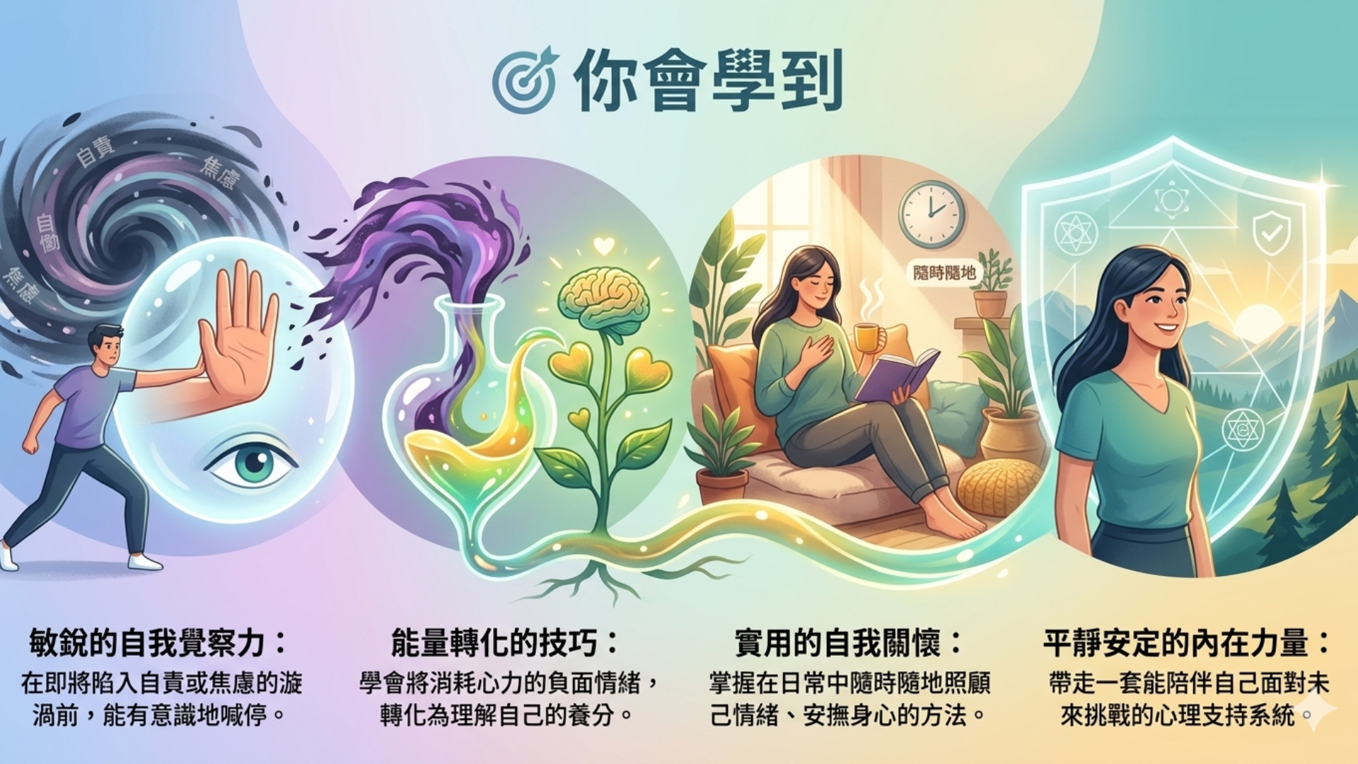• 啟動內在支持系統:運用圓滿意識,建立一套在日常生活中能穩穩接住自己的安定機制。