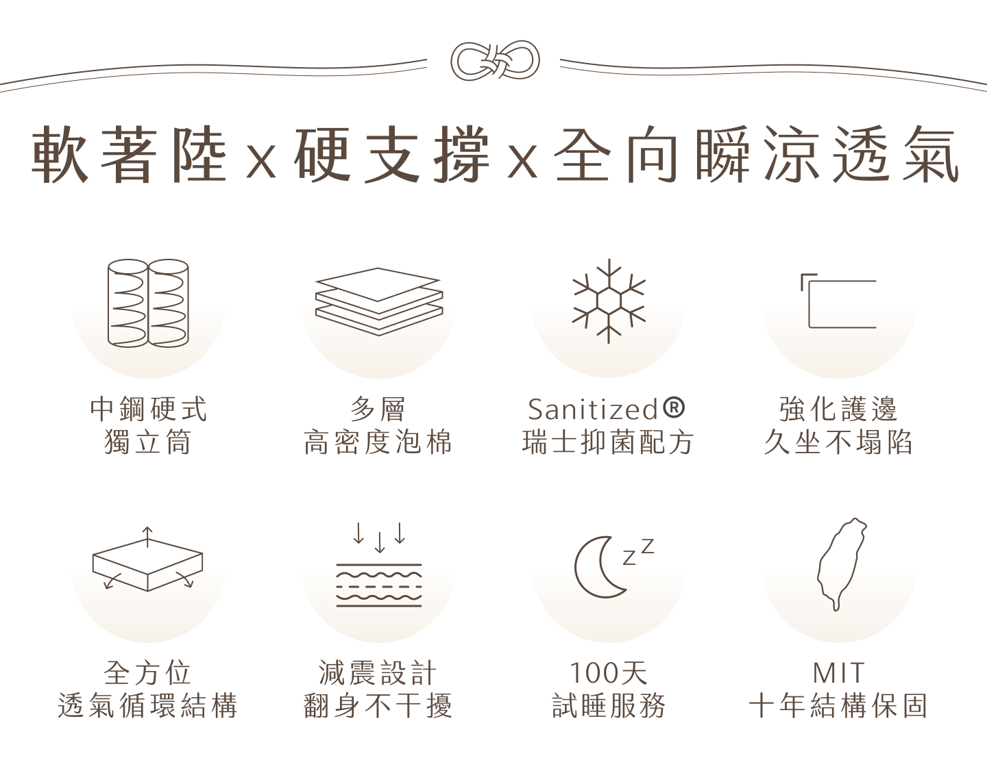 打破了床墊界「軟硬無法兼得」的世紀難題!這張守序床墊能像雲朵般包覆你的緊繃、又像地基般穩托脊椎,更排除了一切干擾修復的燥熱,成為你夜晚專屬的能量充電站。